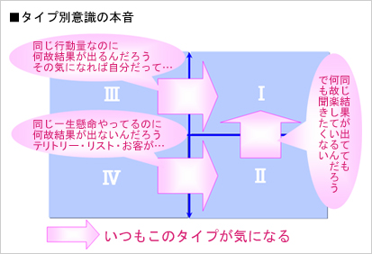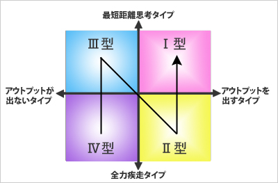 IV型は同じ全力疾走タイプのII型を意識します。「一生懸命やっているのに、あの人は結果が出て、なぜ俺は結果が出ないんだ?」と思っています。